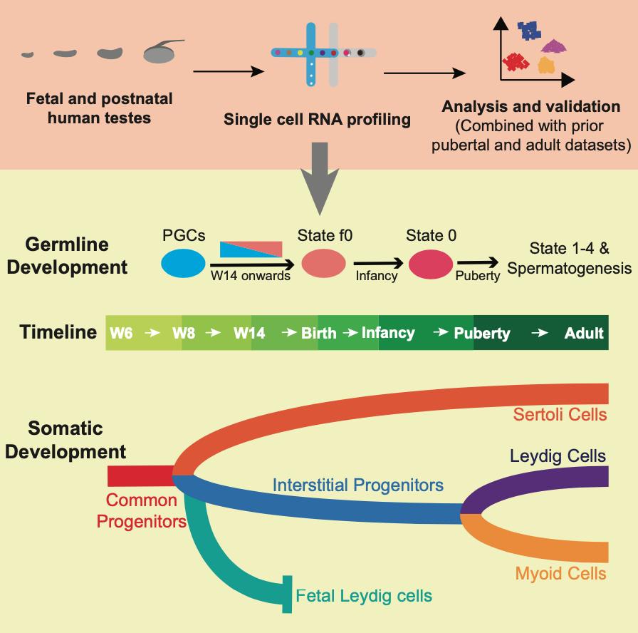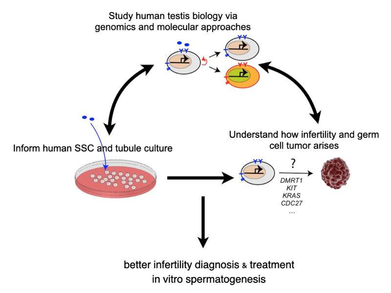 | 本研究组的终极目标是希望通过对人类的生殖干细胞进行更加深入地了解,从而以此为基础进行雄性不育的诊断与治疗。近些年来,我们利用最新的单细胞高通量测序,在生殖细胞和睾丸发育的领域上做出了很多突出贡献。例如,我们发现了一类人类特有的生殖干细胞并命名为State 0。我们还系统性地阐述了成年人体内的State 0干细胞是如何从胚胎里面分化出来的,又是如何继续向后分化源源不断地产生精子的。同时,我们还发现了睾丸内体细胞的发育成熟伴随且引导着生殖细胞的发育而成熟的分子过程。迄今为止,我们已经在各类高影响力的国际期刊上发表了超过20篇文章,其中包括 Cell Stem Cell, Nature Genetics, Cell Research, American Journal of Human Genetics 等。  Goals and approaches of our research.  A transcriptional single-cell atlas of the fetal and postnatal human testes. We uncovered how adult SSCs originate from the fetal PGCs, and how somatic differentiation accompanies and guides human fetal germ cell development. | 研究内容和目标: 本研究组主要有三个研究重点。第一,我们利用最新的测序和分子生物学技术来研究人类生殖细胞和睾丸发育的正常过程。第二,我们希望建立起全新的分子生物学和计算方法,来对雄性不育进行更好、更精确地诊断与治疗。第三,我们希望利用所获得的的知识,发展出新的体内和体外的模型来更好地模拟研究人类精原干细胞。 代表性发表论文: - Cui L#, Nie X#, Guo YX#, Ren P, Guo YF, Wang X, Li R, Hotaling JM, Cairns BR*, Guo J*. Single-cell transcriptomic atlas of human testis across the reproductive lifespan. Nature Aging. 2025 Mar 3. (On Line)